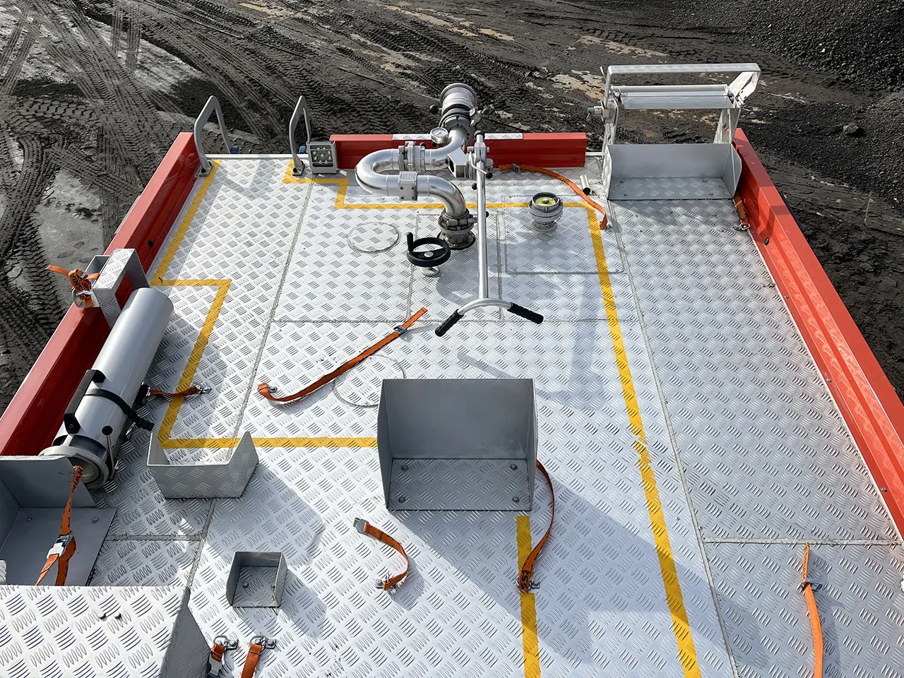 Hose reel: Water-foam, 40 m hose (diam. 19 mm), electric drive, brake, nozzle capacity 230 l/min at 40 bar.