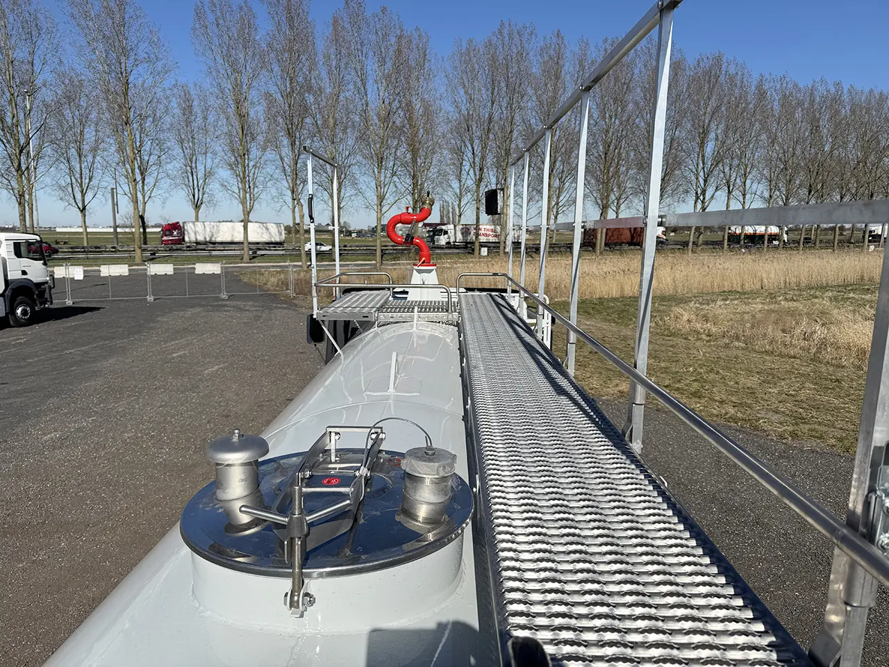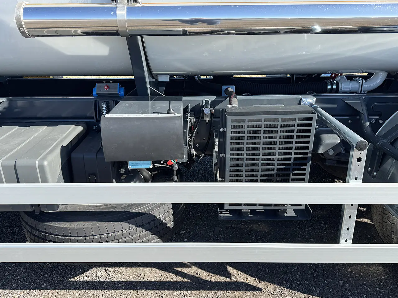 Spray bars with pressure working nozzles are mounted on the front and the rear end of the truck.