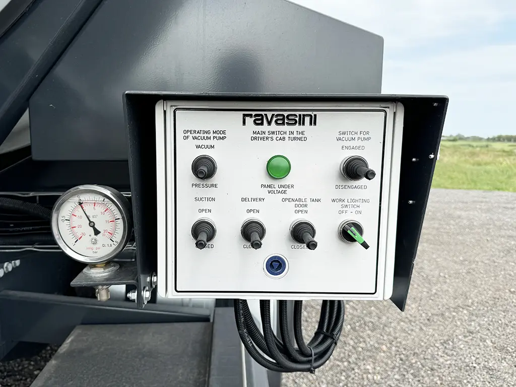 Vacuum pump installed between the cab and the tank, hydraulically driven, capacity 15.000 l/min (900 m3/h)